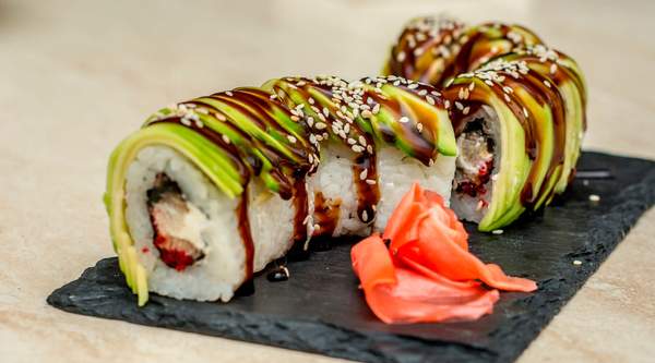 Nigiri enrollado relleno de pez mantequilla, aguacate, tobikos y salsa del chef.