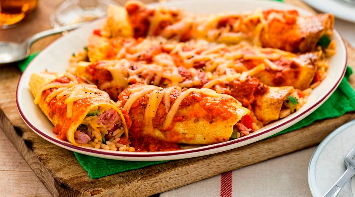 Tortillas de maíz rellenas de pollo preparado, bañadas en salsa de tomate verde y rojo, y un poco de nata.