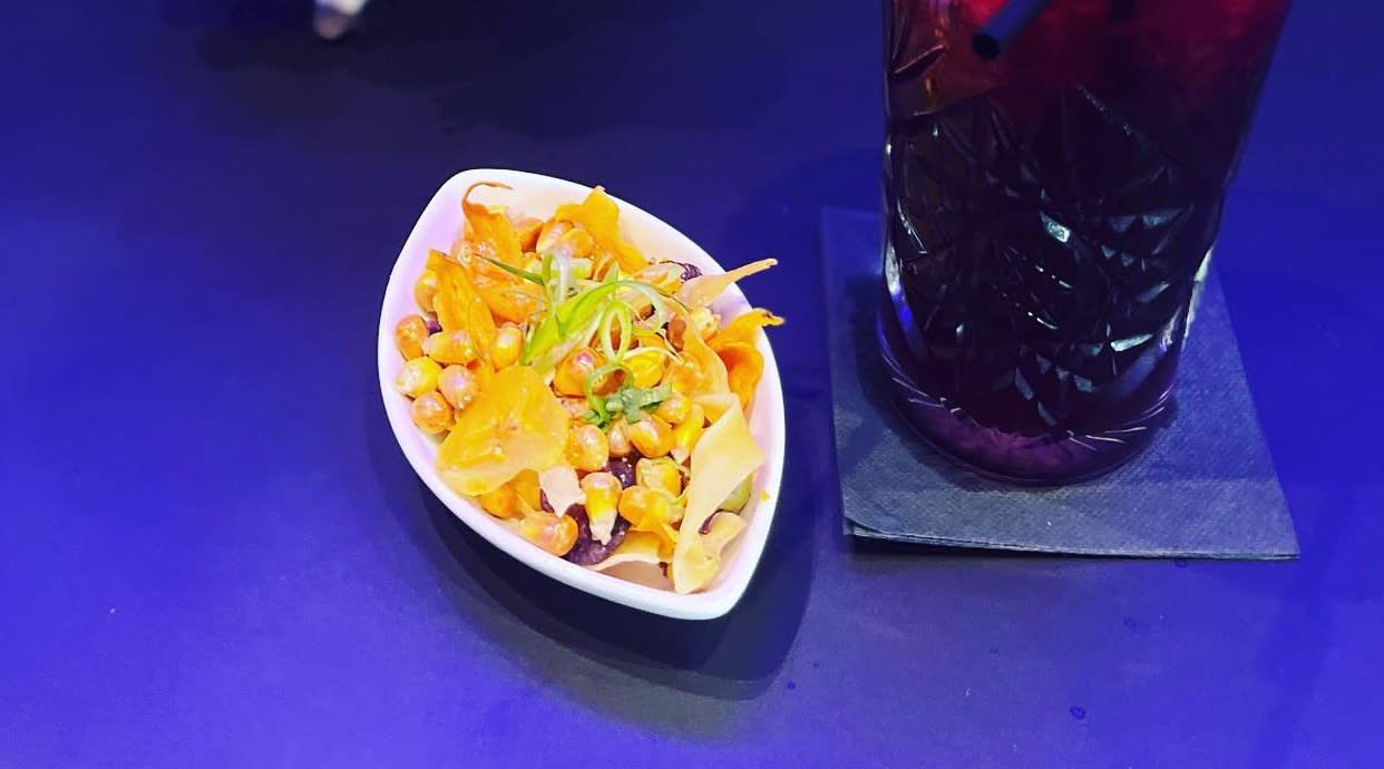 Corvina, chicharrón de calamar, choclo, cancha, puré de boniato y leche de tigre de rocoto.