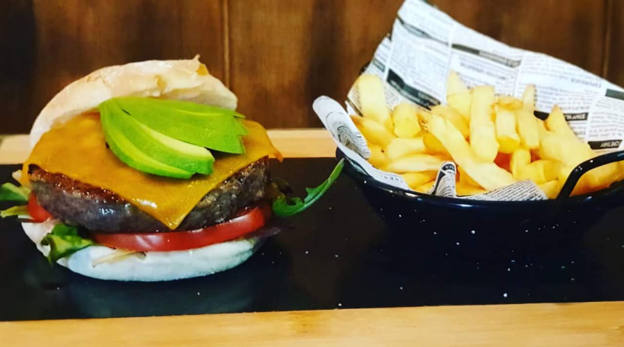 Carne de ternera (250 g.), lechuga, tomate, cebolla caramelizada, bacon, queso de cabra y aguacate. Acompañada de patatas fritas