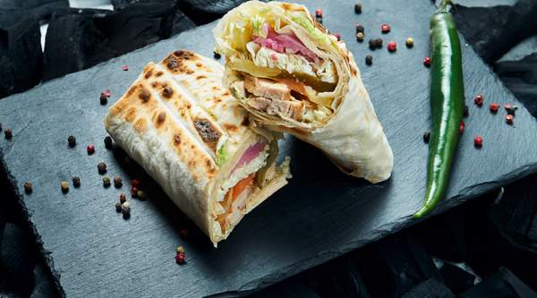 Pan tortilla 25 cm, kebab carne halal ternera,casero receite original Mediterraneo, cebolla Roja, remolacha pepino zanhoria, lechuga y salsa blanca especial estilo griego light creamy garlic Mayo