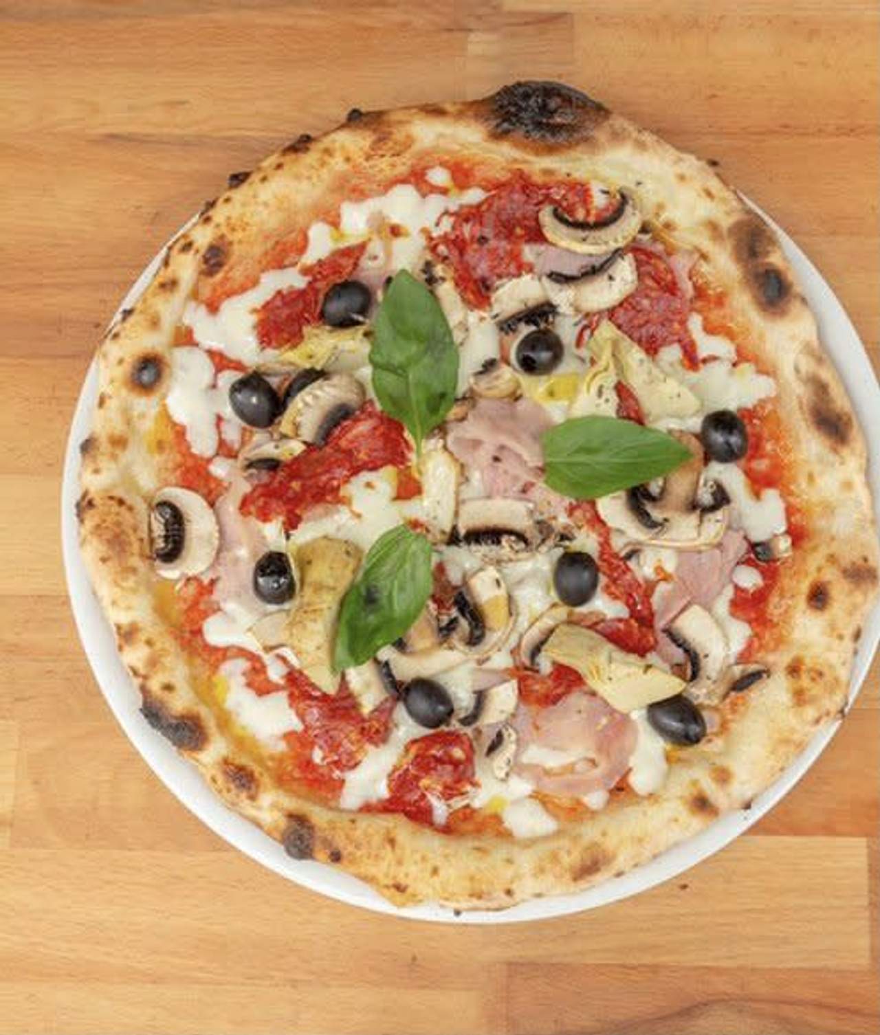 Tomate, mozzarella, jamón dulce, champiñones, salami picante, alcachofas, aceitunas, albahaca