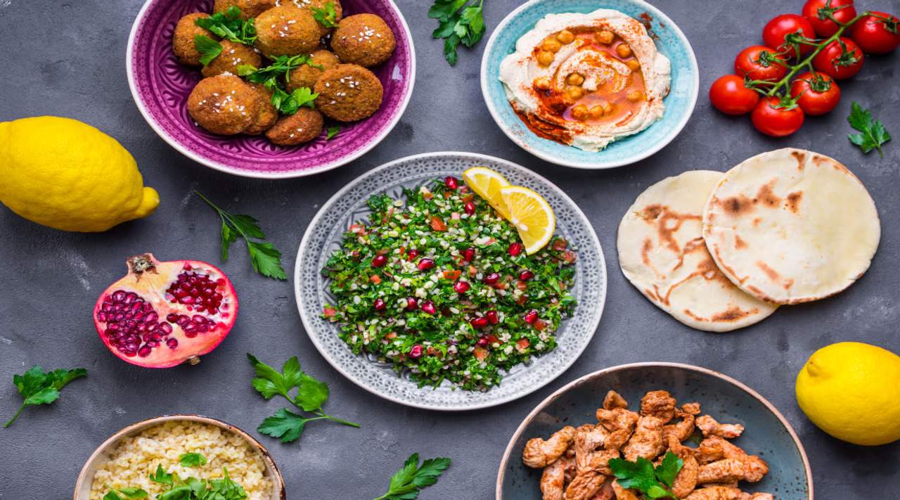 Hummus (crema de garbanzos y salsa sésamo), Mutabal (crema de berenjena y salsa sésamo), Warak inab (hojas de parra rellenas de arroz ), Falafel (croquetas de garbanzos y cilantro) y Arroz (preparado con fideos finos que contienen gluten). (vegano)