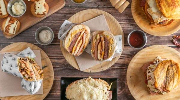 3 discos de cachapa, hamburguesa de ternera fresca de 200g, 3 tiras de bacon jugoso, queso de mano venezolano.