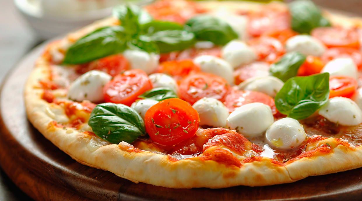 Tomate, mozzarella, jamón dulce, champiñones y orégano