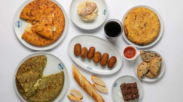 Tortillas medianas (2 uds.), croquetas (6 uds.), entrante, embutido y 2 barras de pan con 1 tomate