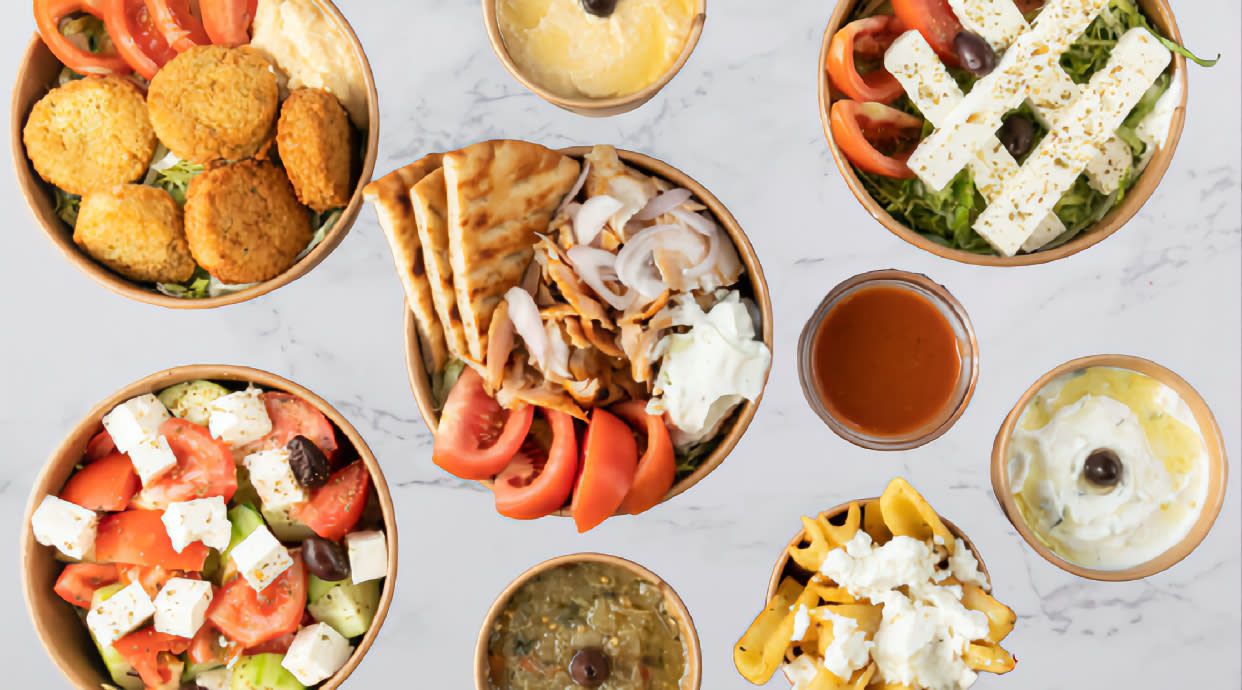 Pita, gyros, moussaka carne, dolmadakia, feta, tzatiki y ensalada