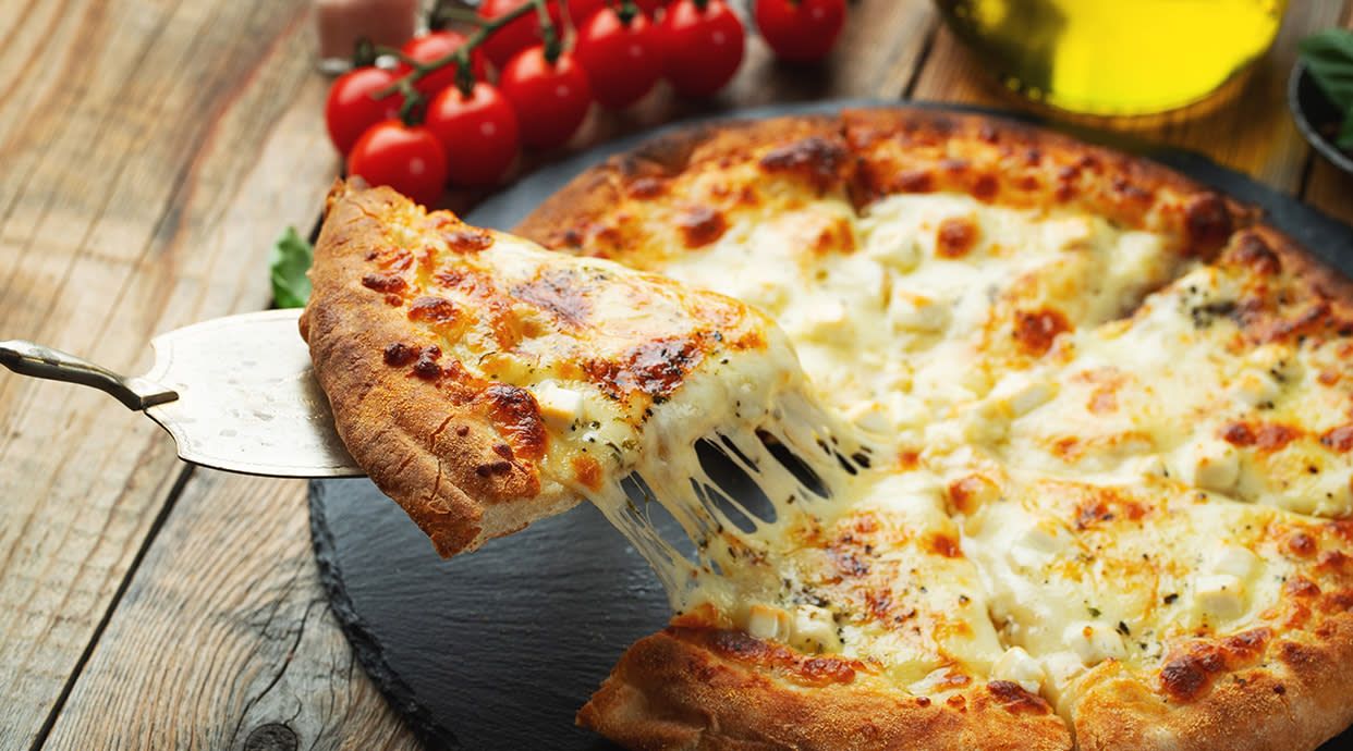 Tomato base y BBQ, 100% halal, bacón de pavo, cebolla, queso cheddar y mozzarella