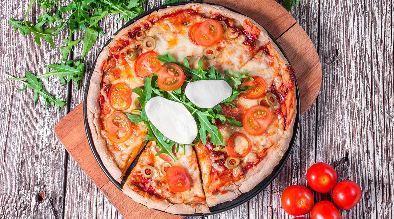 Salsa de tomate, mozzarella, jamón, champiñón, oliva, cebolla y orégano