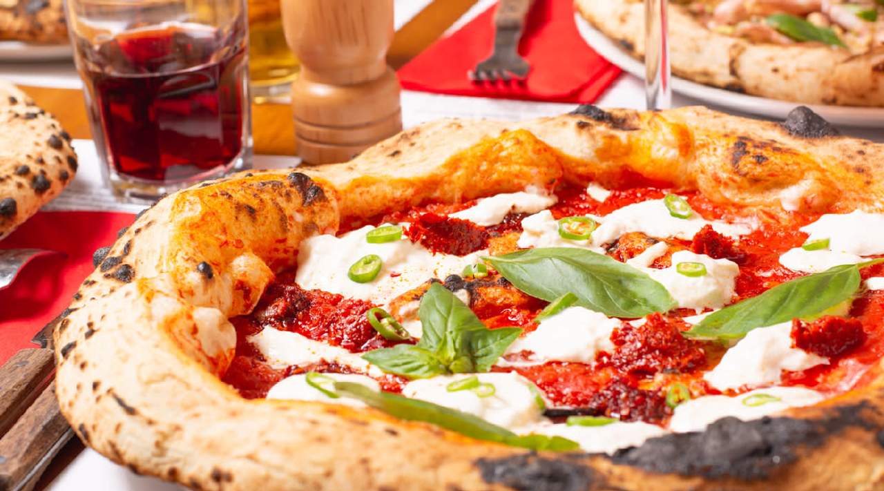 Con tomate San Marzano, mozzarella FDL, jamón dulce y aceite extra virgen