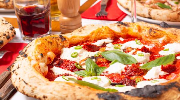 Con tomate San Marzano, mozzarella de búfala, albahaca y aceite extra virgen