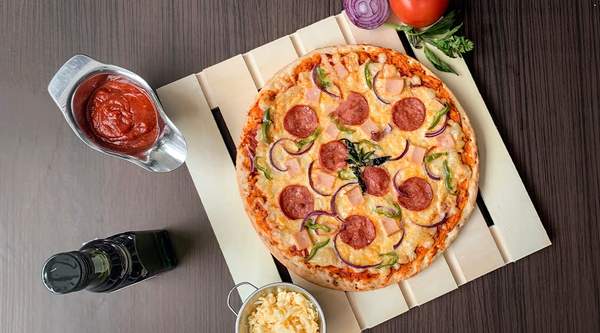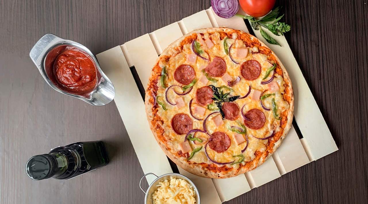 Tomate, mozzarella, jamón, salami y champiñones.