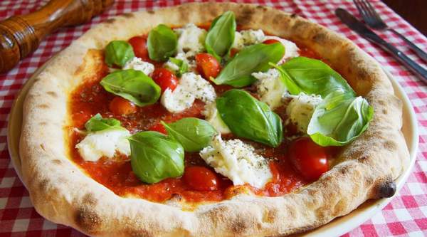 Salsa tomate, base de mozzarella, olivas negras, anchoas y albahaca fresca
