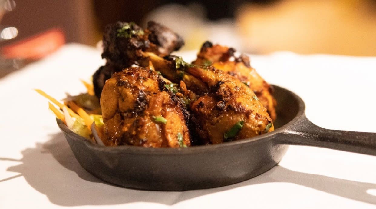 Brocheta de cordero suavemente especiada y asada al tandoor, servida con salsa especial, contiene huevo y productos lácteos