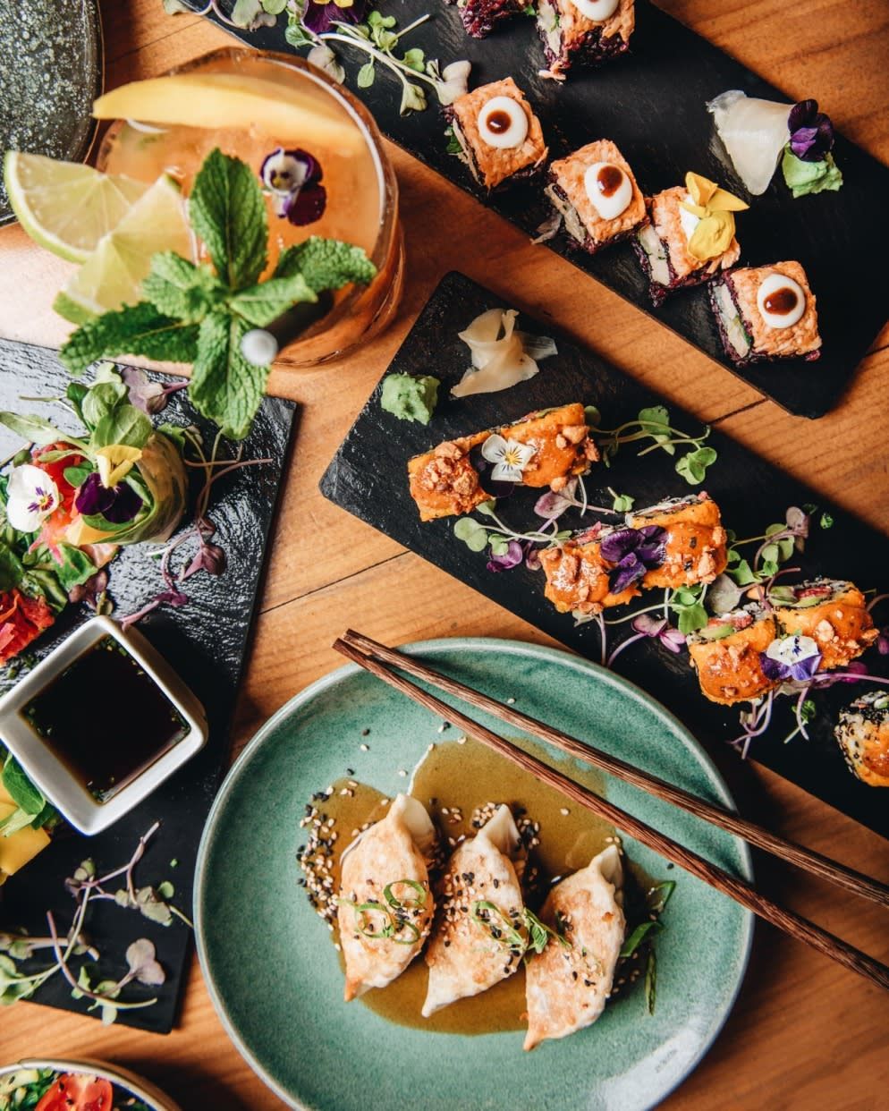 relleno de setas y edamame con salsa dashi dulce de Roots & Rolls