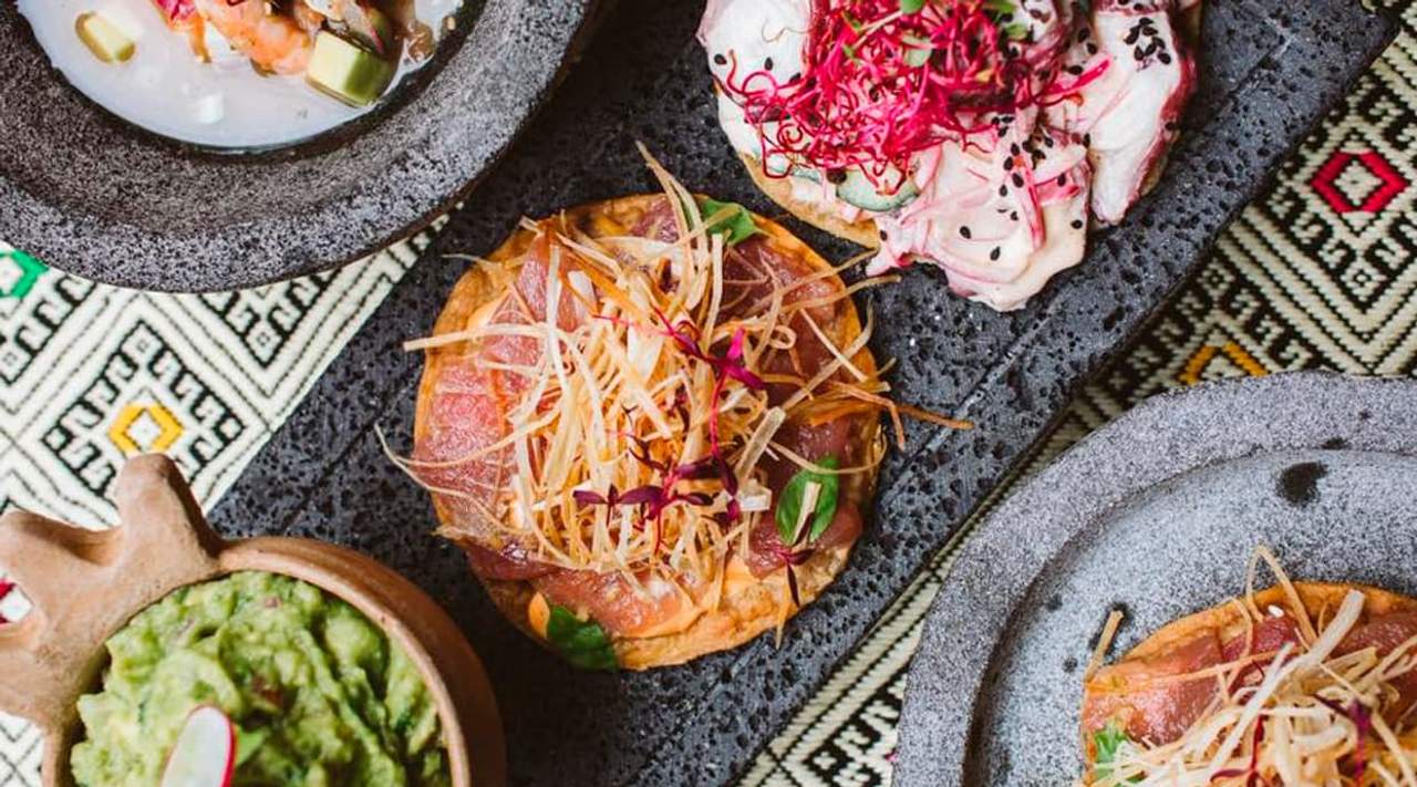 De pescado, langostinos y pulpo, cebolla morada y pepino marinados en salsa tatemada de chile morita y zumo de lima. Coronado con rebanadas de aguacate.