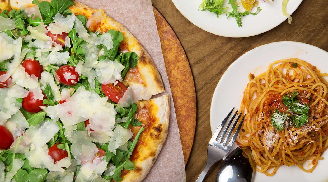 Tomate, mozzarella, jamón de Parma, rúcula y parmesano