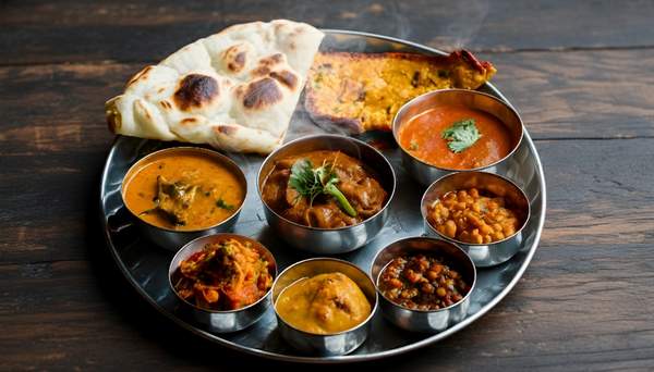 Pan del sur de la India, hojaldrado y esponjoso, servido con puré de patata y curry.