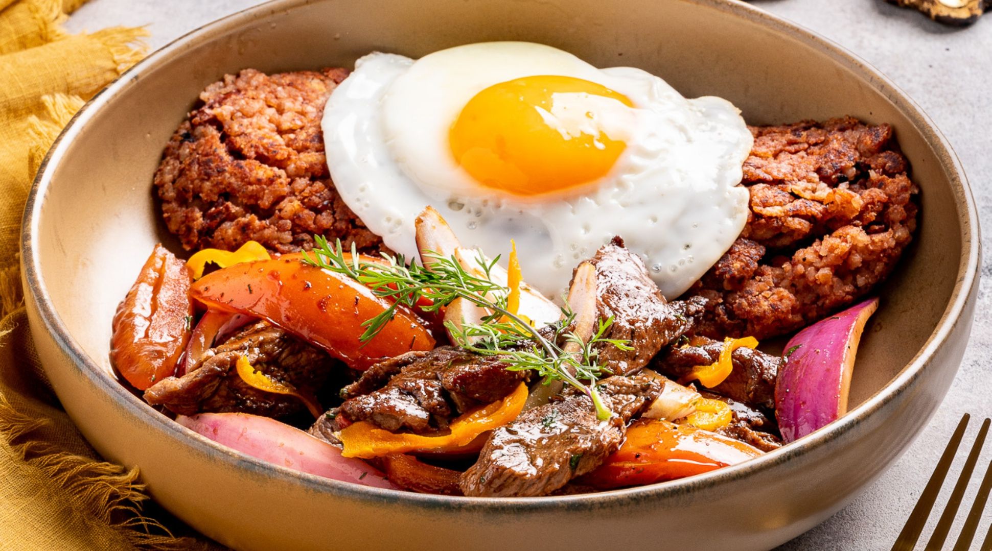 Solomillo de vaca, arroz salteado, pimientos, huevo frito, plátano maduro y salsa oriental