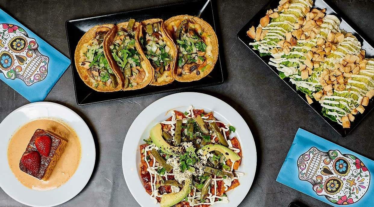 Nopal asado en tortillas de maíz ahogado en salsa y queso al horno con queso fresco y chile pasilla.