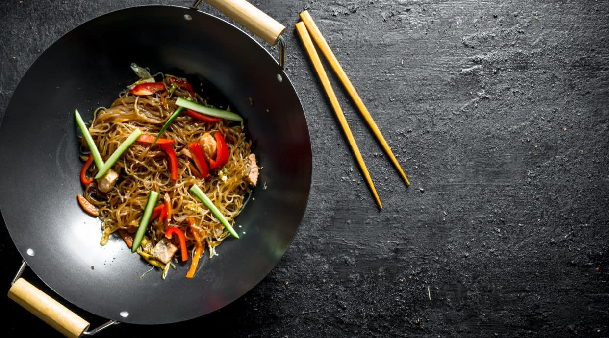Tallarines de arroz salteados al yakisoba con verduras, huevos y ( gambas)