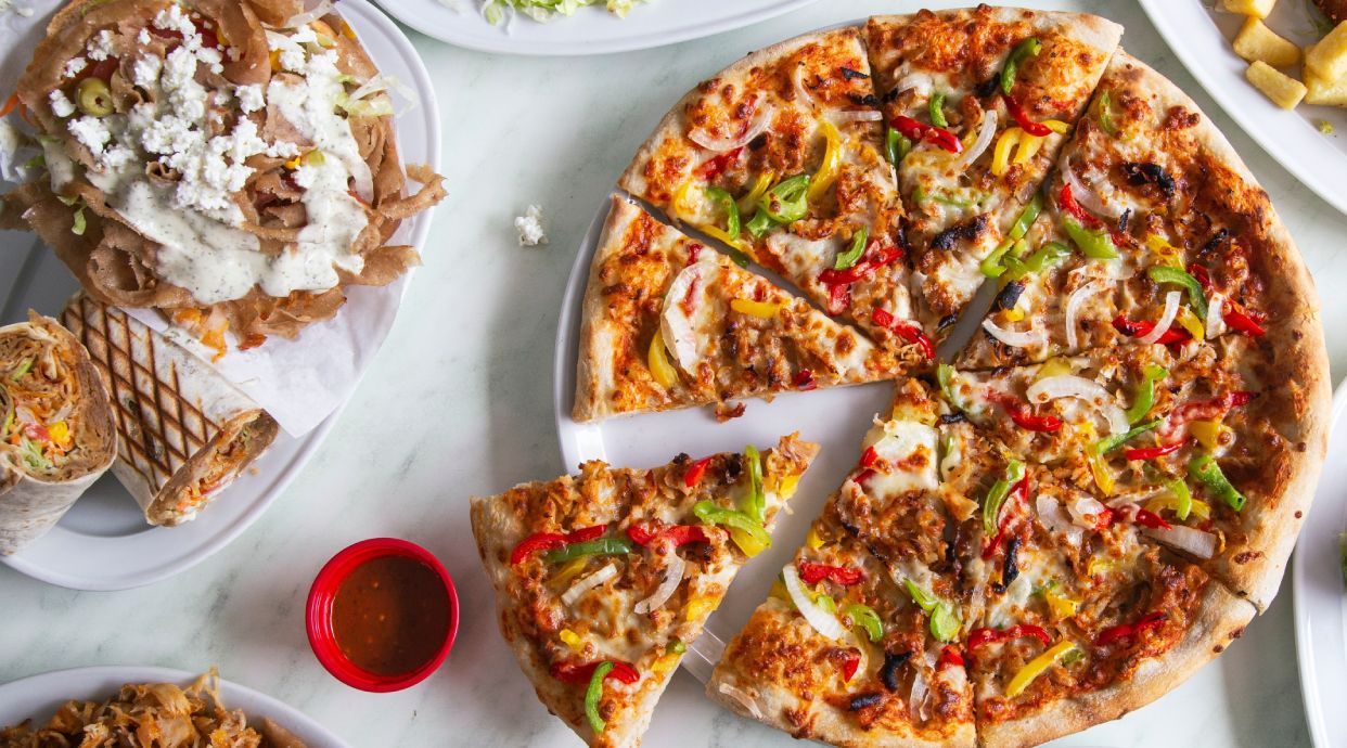 Tomate, mozzarella, queso, orégano, doner carne y ajo