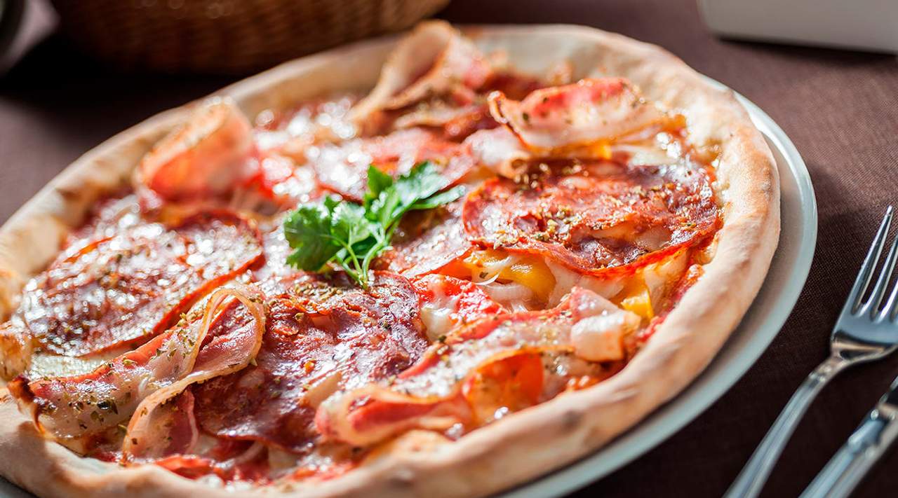 Tomate, Mozarella, Provolone, Jamón, Tomate Natural, Ajo y Aceitunas