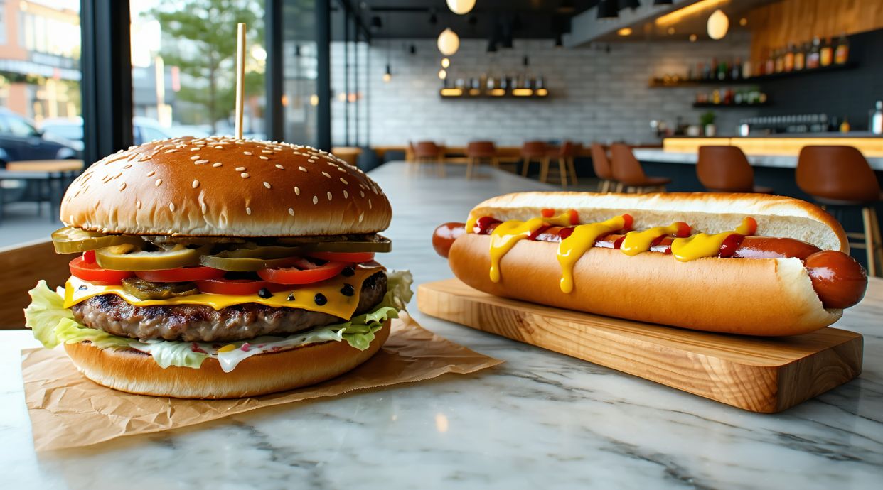 Ternera (160g.), pollo (160g.), pan baguette de 30 centímetros, queso grana padano, patatas naturales y acompañado con ensalada césar de la casa
