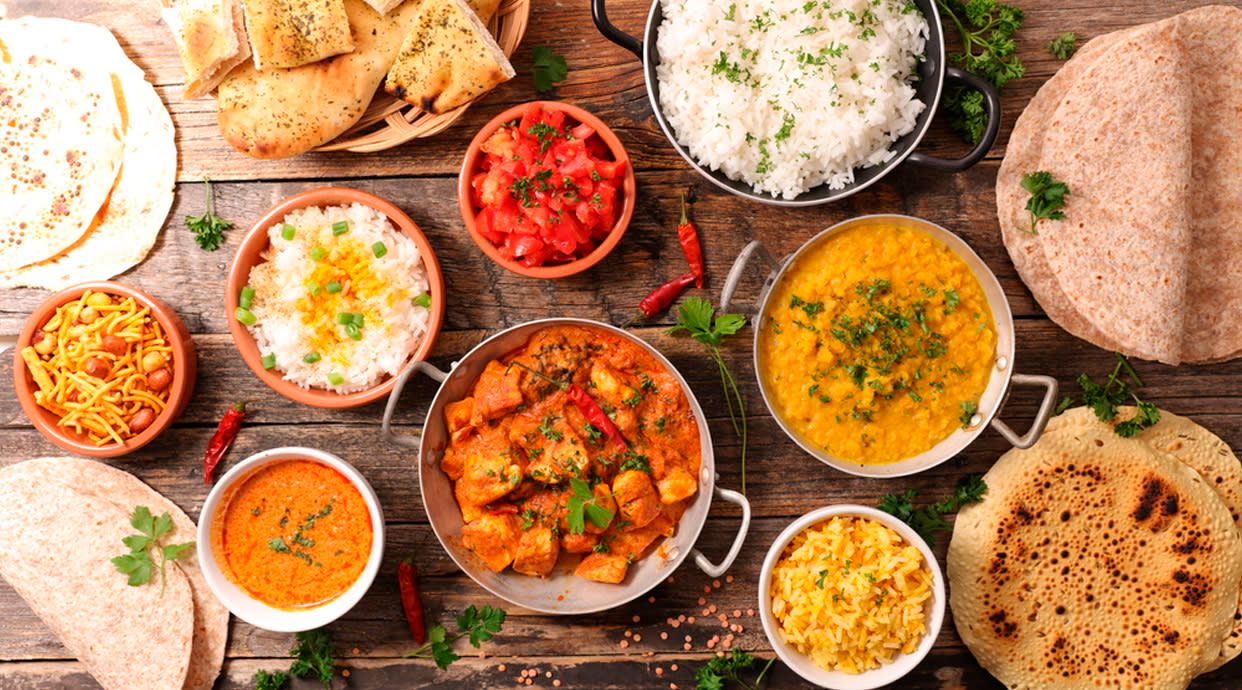 Platos exóticos cocinados con curry, tomate, pimiento rojo y verde, cebolla juliana, cilantro y especias especiales