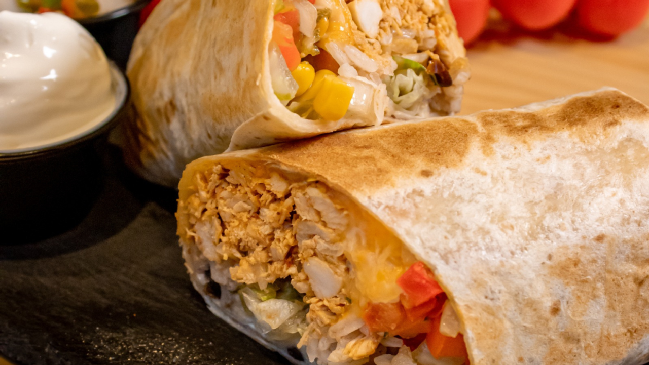 Tortilla de trigo envuelta con guiso vegano de chili con carne, lechuga tomate en dado, pico de gallo, frijoles, maíz y arroz, elige entre salsa mexicana verde o roja