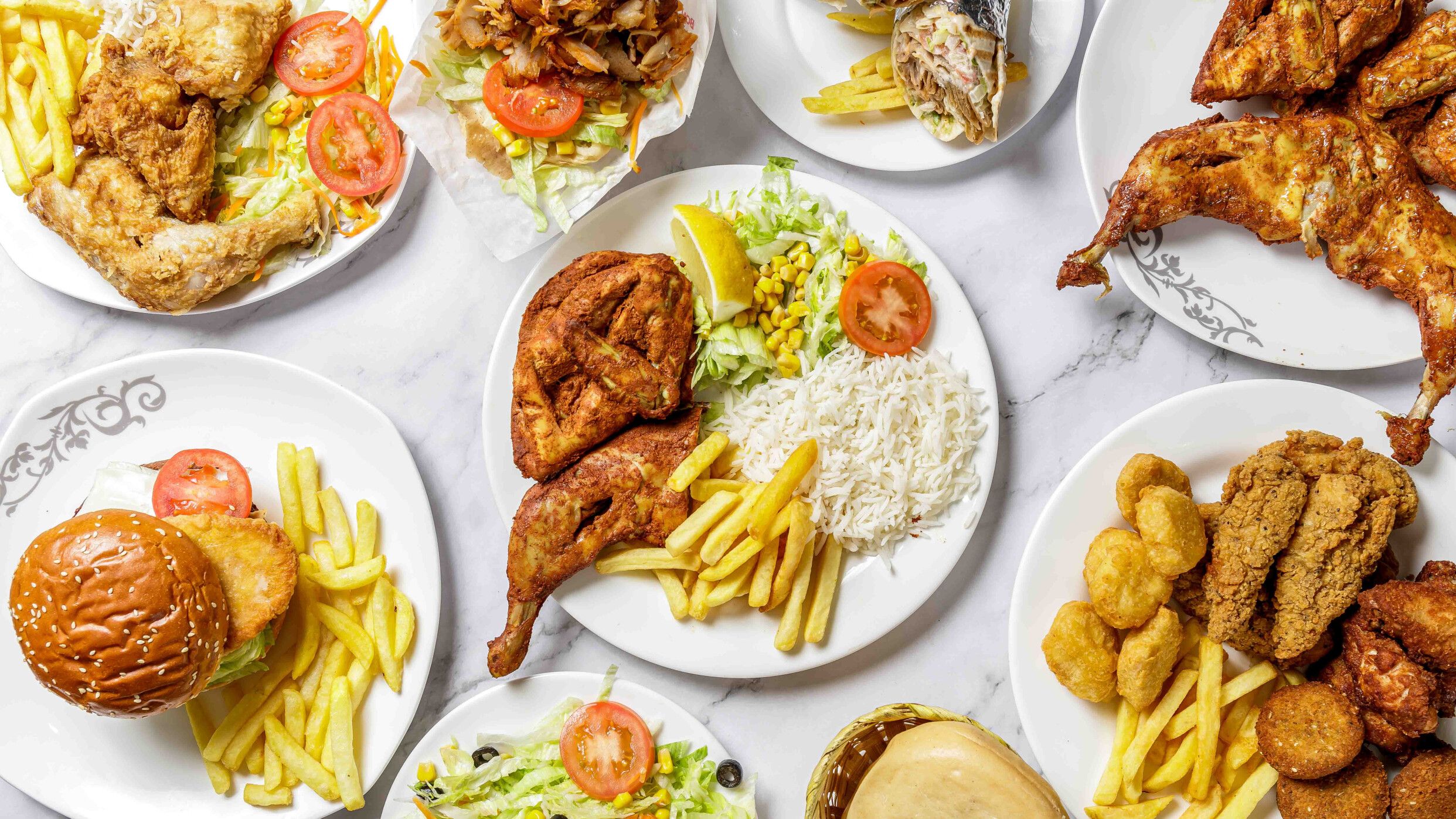 De pollo, carne o mixtos, patatas fritas (1 ud.) y bebida a elegir (2 lt.)