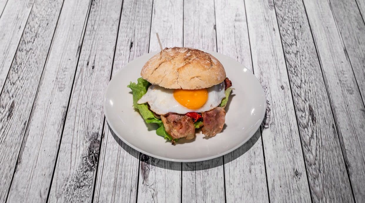 Lechuga, cebolla pochada, bacon, queso, pimiento rojo y tortilla francesa