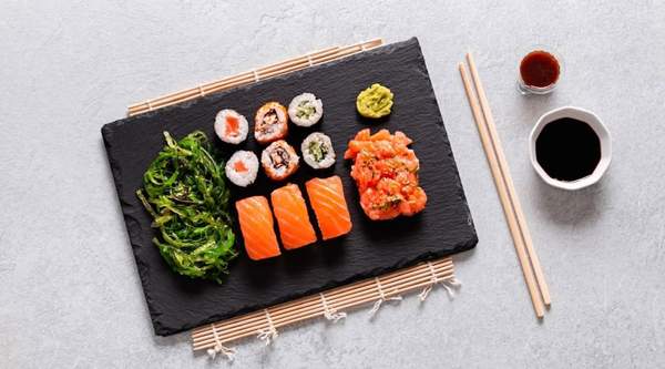 6 Sashimi atún, 6 sashimi salmón, 6 maki aguacate, 6 maki kampio, 8 rollos california, 8 rollo naruto, 4 gunkan ikura y 2 nigiri salmón