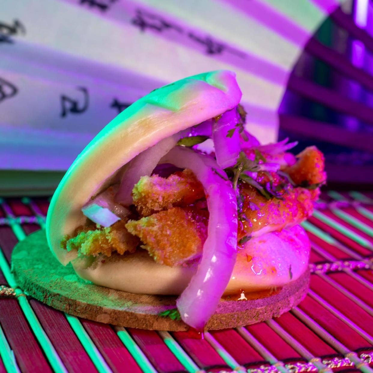 Crujiente langostino frito con cebolla morada ,salsa sweet chilly y cilantro . Con un toque picante