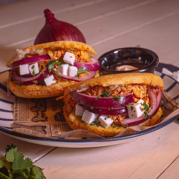 Pechuga de pollo desmenuzada cocinada en adobo, cebolla morada y cilantro.