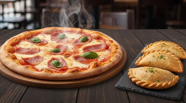 Salsa de tomate, mozzarella, jamón cocido, pimiento y ají asado y orégano