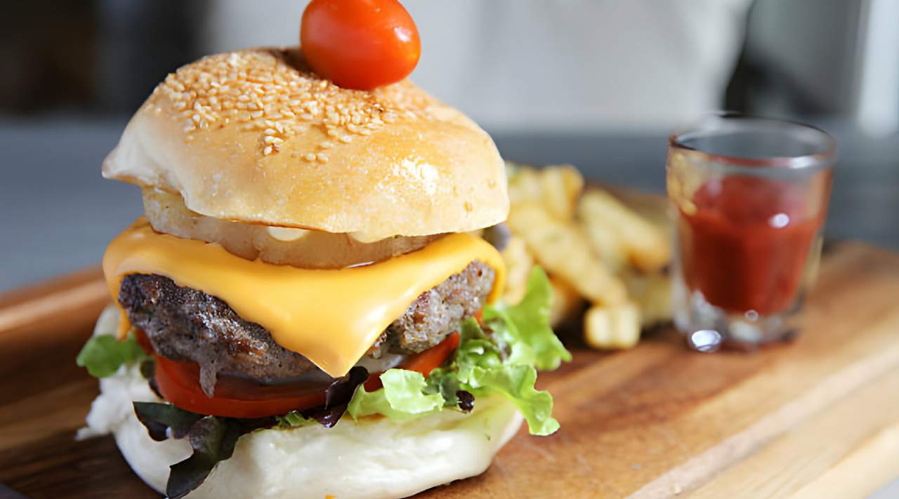 Carne de ternera, lechuga, tomate, cebolla, bacon y queso, acompañada de patatas fritas