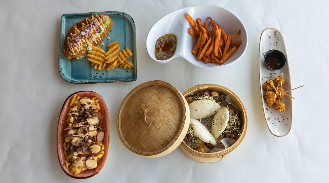 Salchicha vegetariana con verduras, papas fritas, Cheddar fundido fundido y Salsa Vegana Especial .