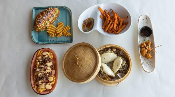 Salchicha, pan especial, cebolla caramelizada, rulo de cabra, crema de setas y champiñones