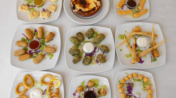 Falafel, hojas de parra, rollo de queso, crema a elegir, verduras y arroz
