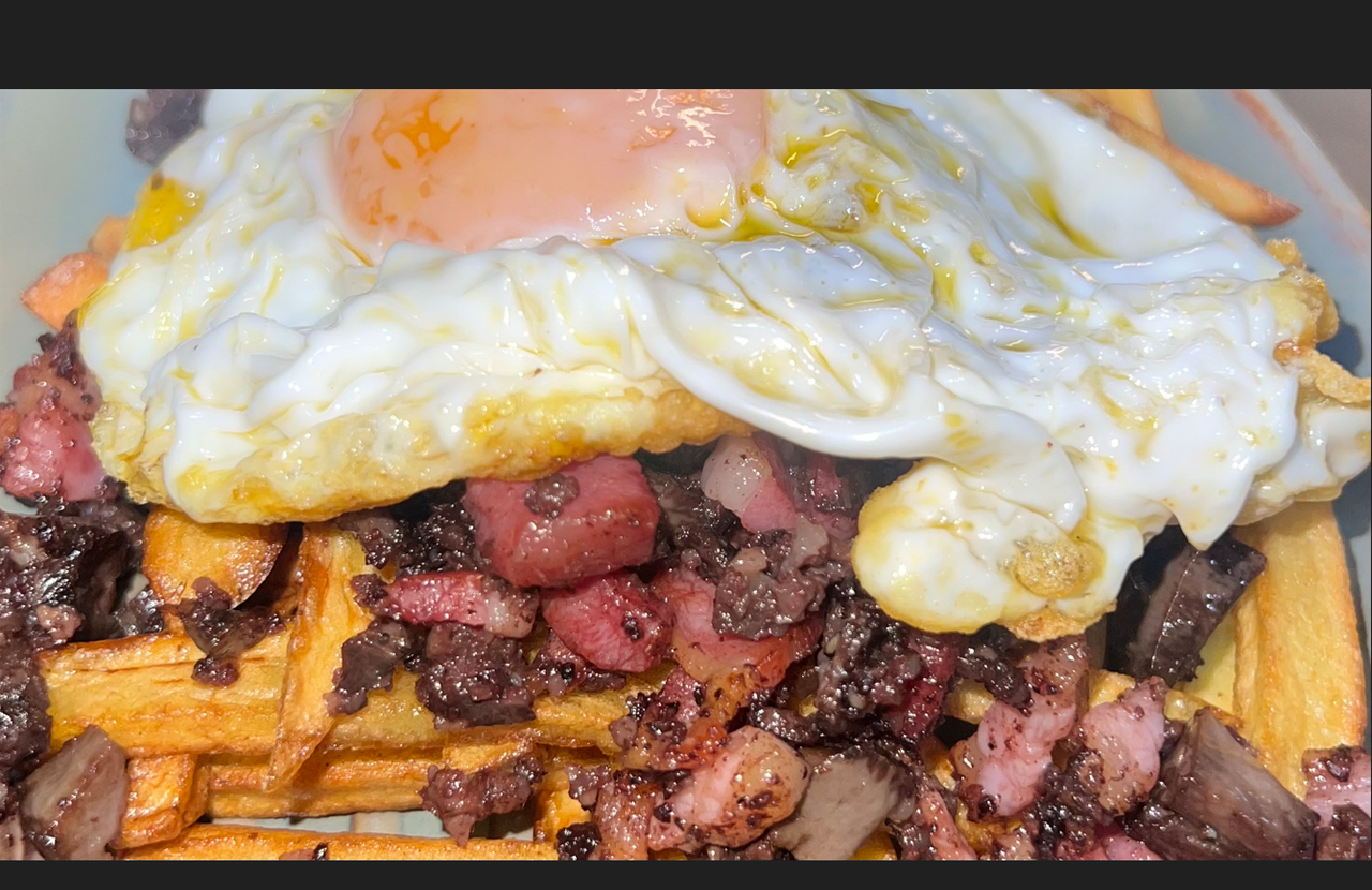 Huevos Rotos Con Butifarra Negra Y Bacon