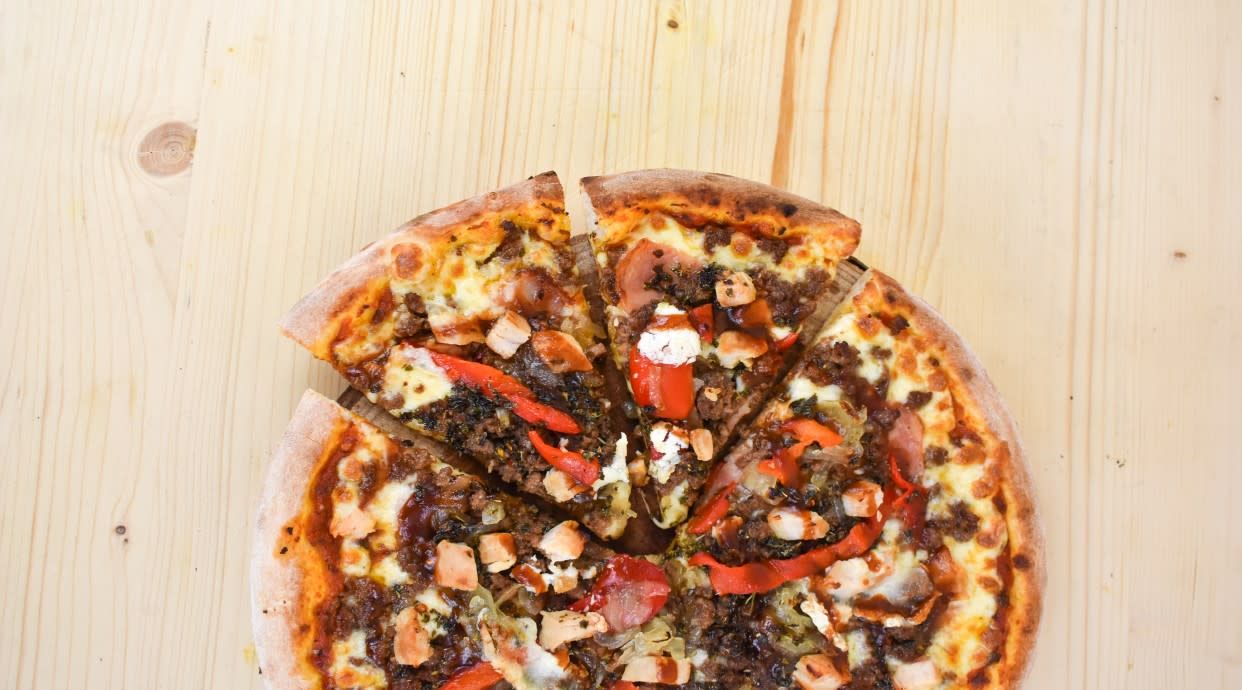 Salsa de tomate, mozzarella, bacón, carne, pollo, cebolla caramelizada, queso de cabra, chimichurri, pimiento y salsa barbacoa