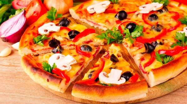 Queso mozzarella 100%, salsa de tomate, champiñones, pimiento verde, cebolla y olivas verdes