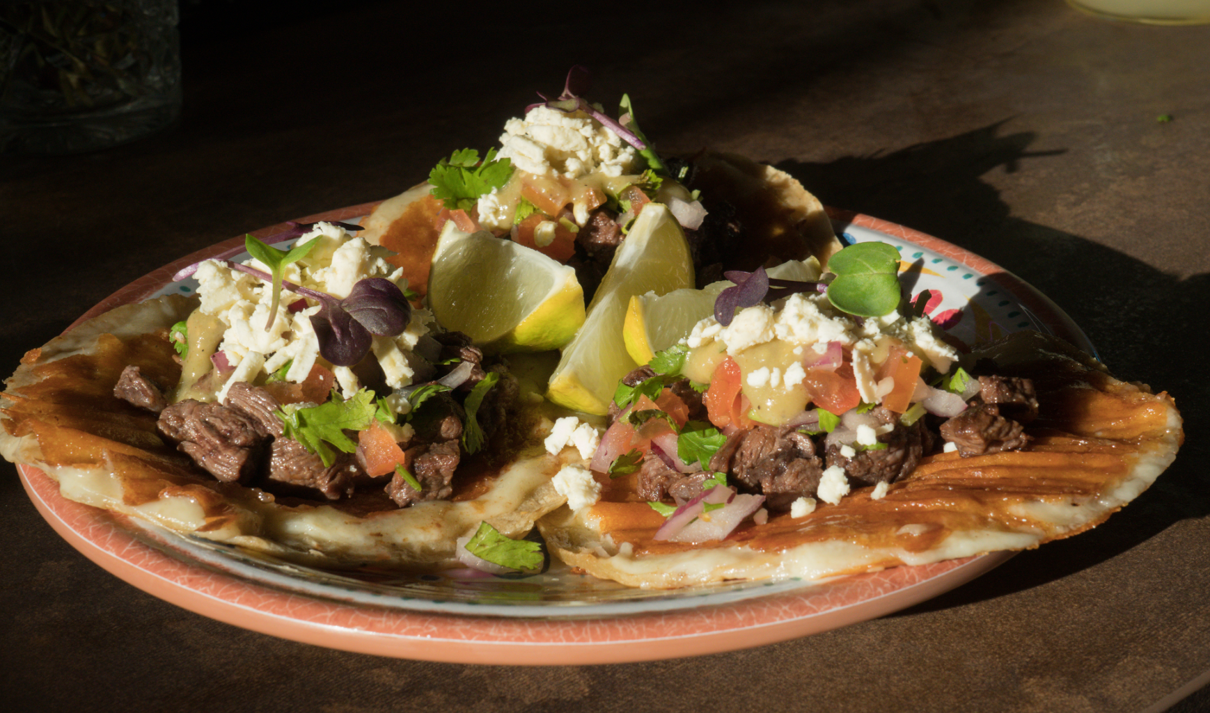 Entraña macerada en vinagre de manzana, pimienta quebrada, salsa roja y pico de gallo