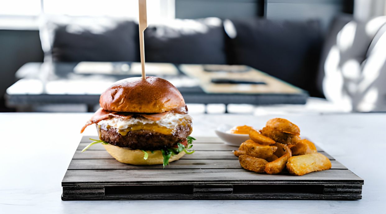 Vacuno (100 g.), tomate, huevo, kétchup, lechuga, queso de cabra, pepinillo y honey mustard
