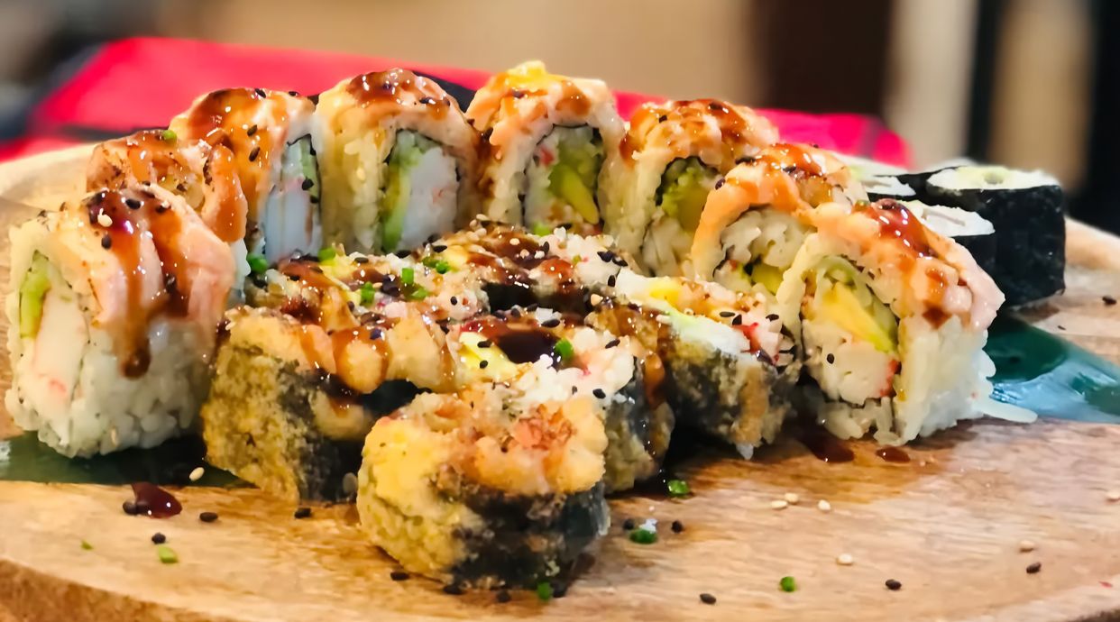 Roll de arroz por fuera con salsa especial, surimi, aguacate, pepino, tobiko y mayonesa de yogur