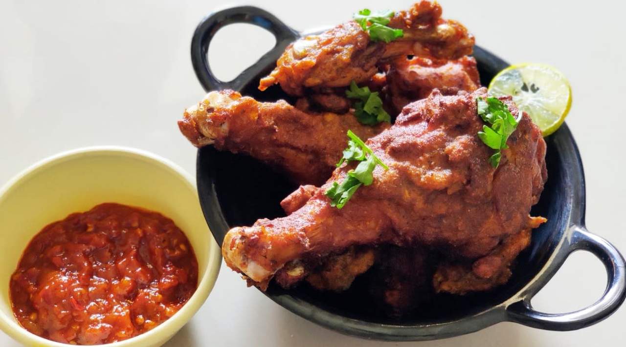 Marinado de muslo de pollo, asado en horno hindú, con salsa curry
