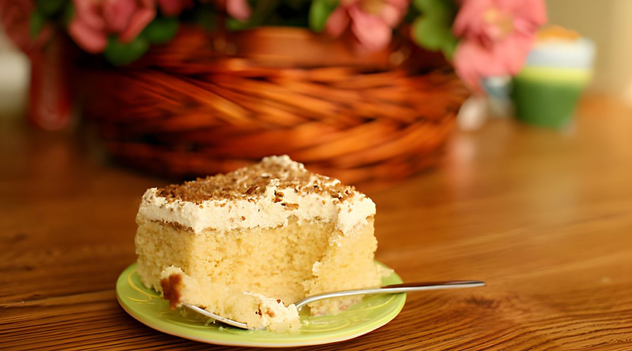 Pastel esponjoso bañado en mezcla de tres leches, cremoso y dulce