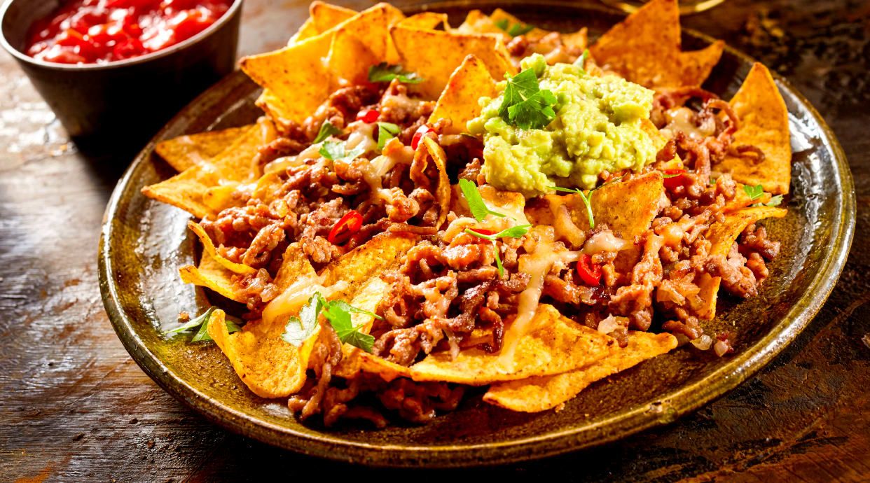 Totopos cubiertos con salsa ranchera, chile con carne, gouda y cheddar