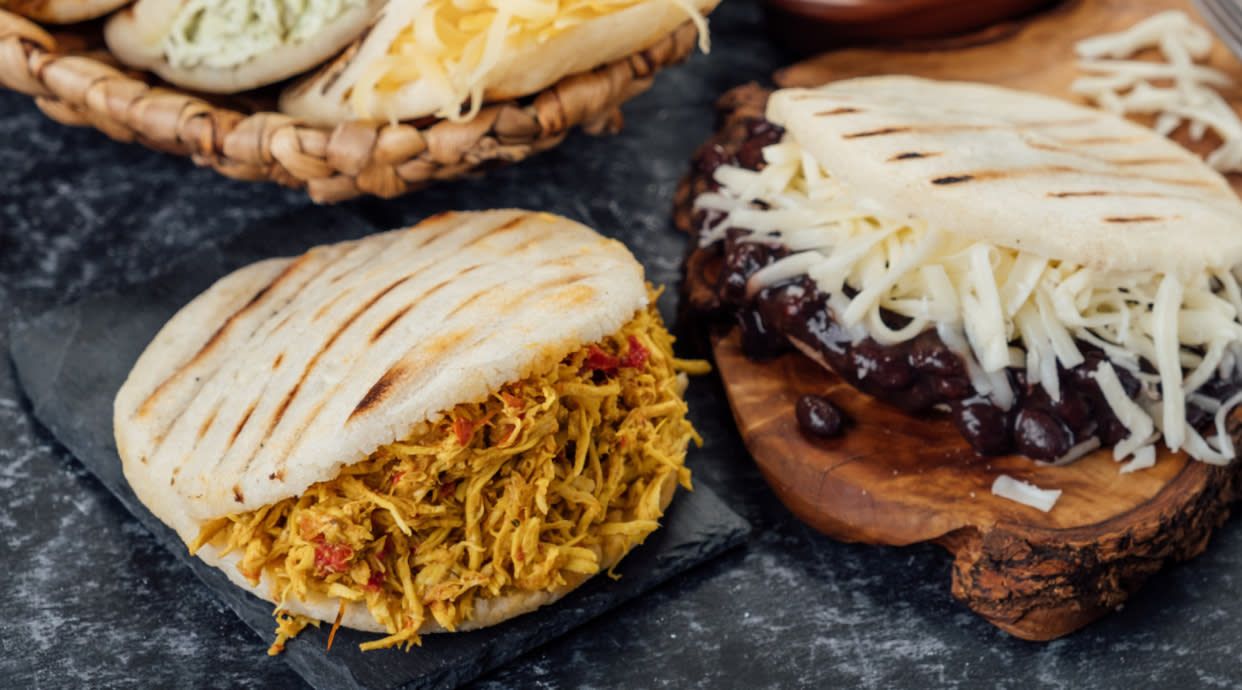 Carne mechada y queso La Arepa es una comida Pre-Colombina preparada a base de harina de maíz con forma circular plana cocinada a la plancha.